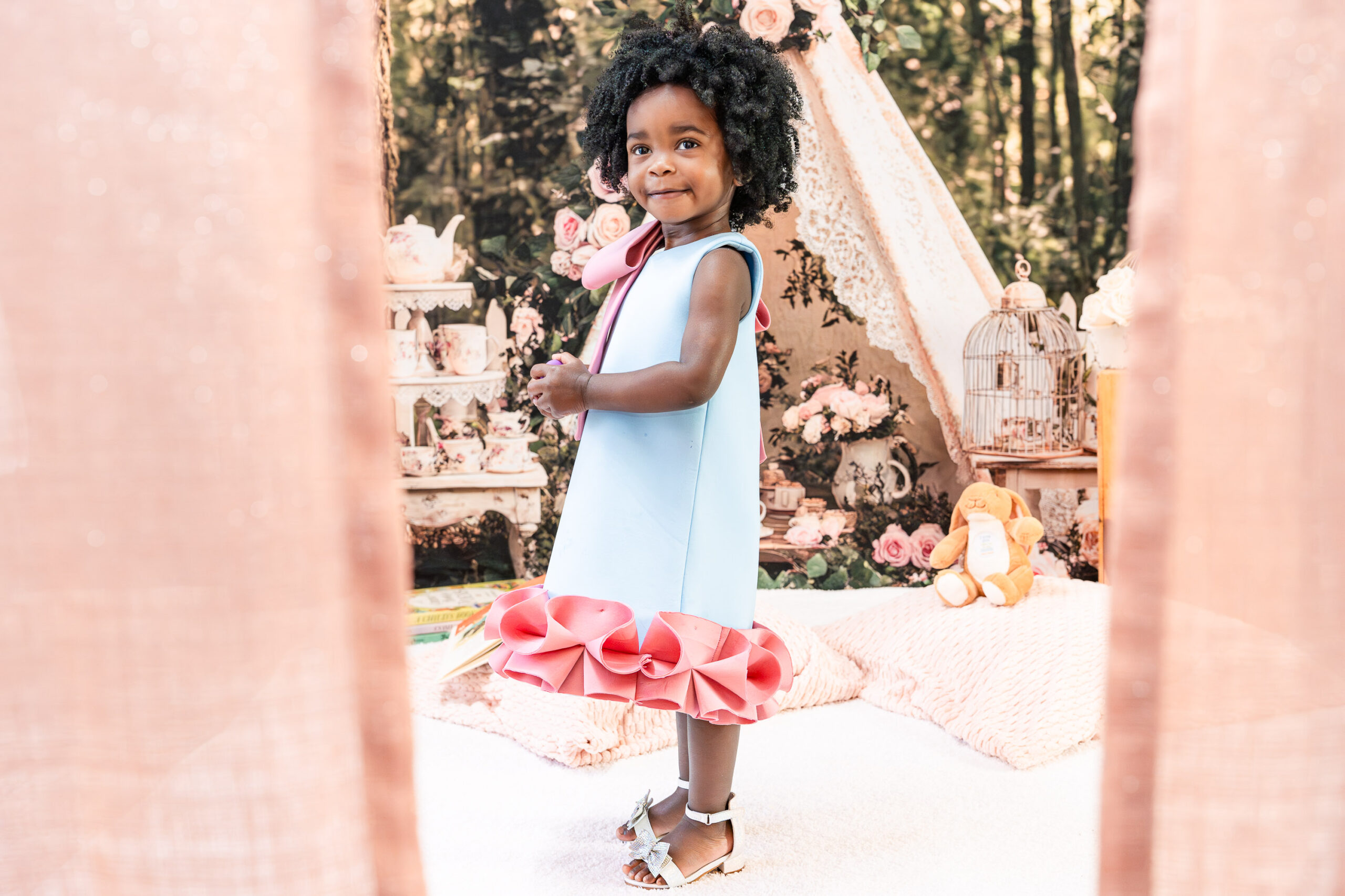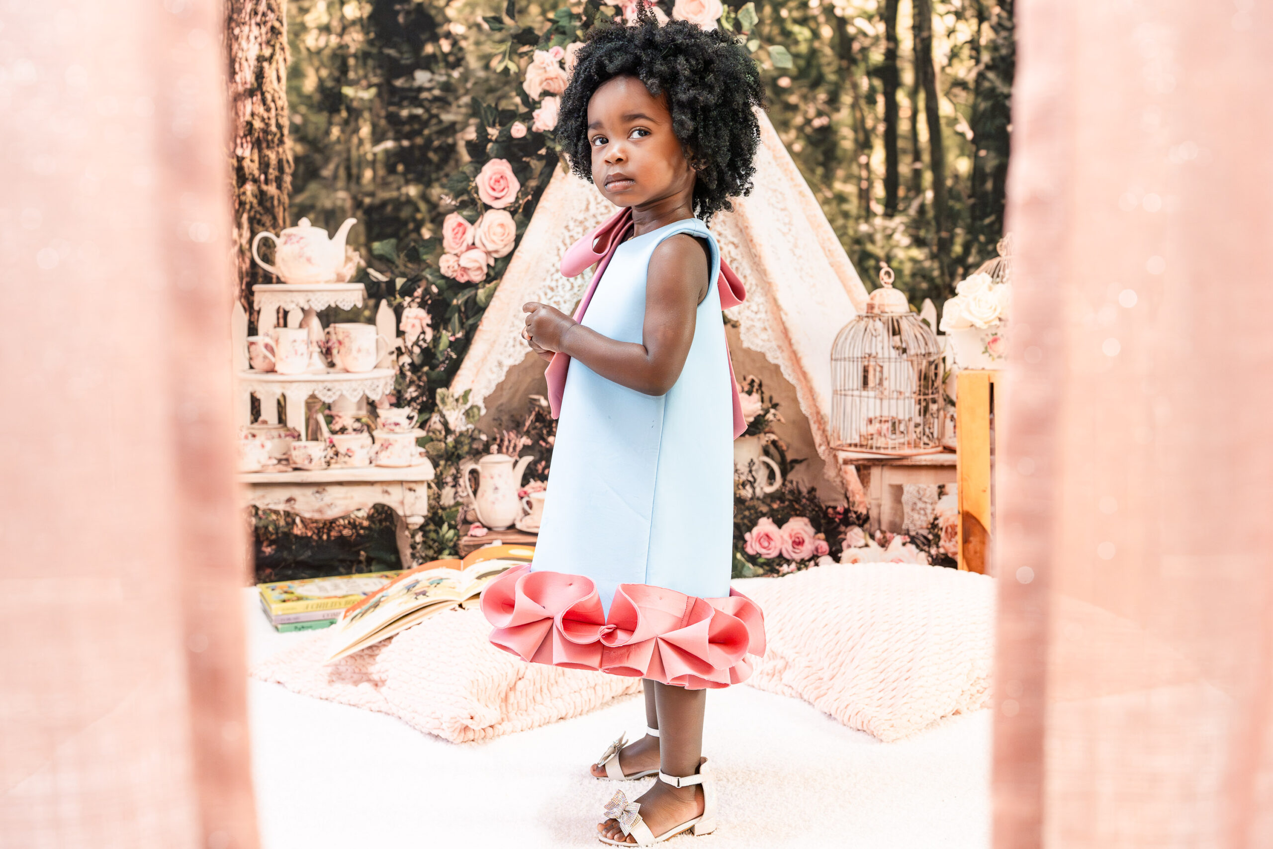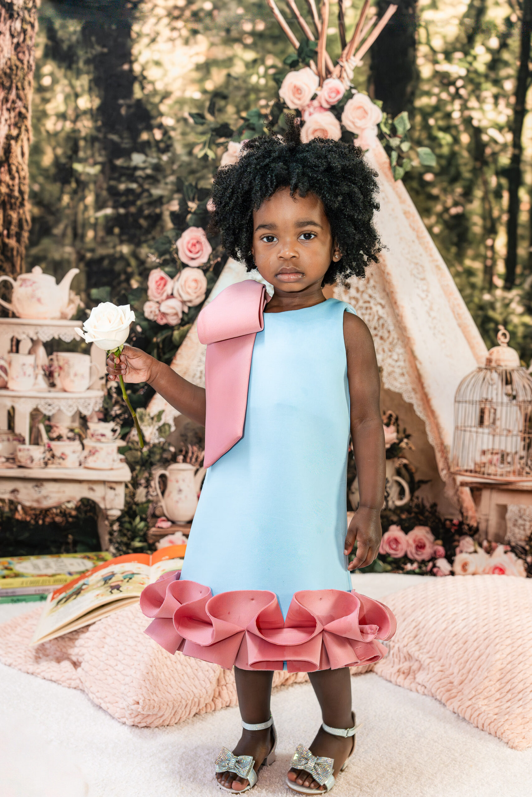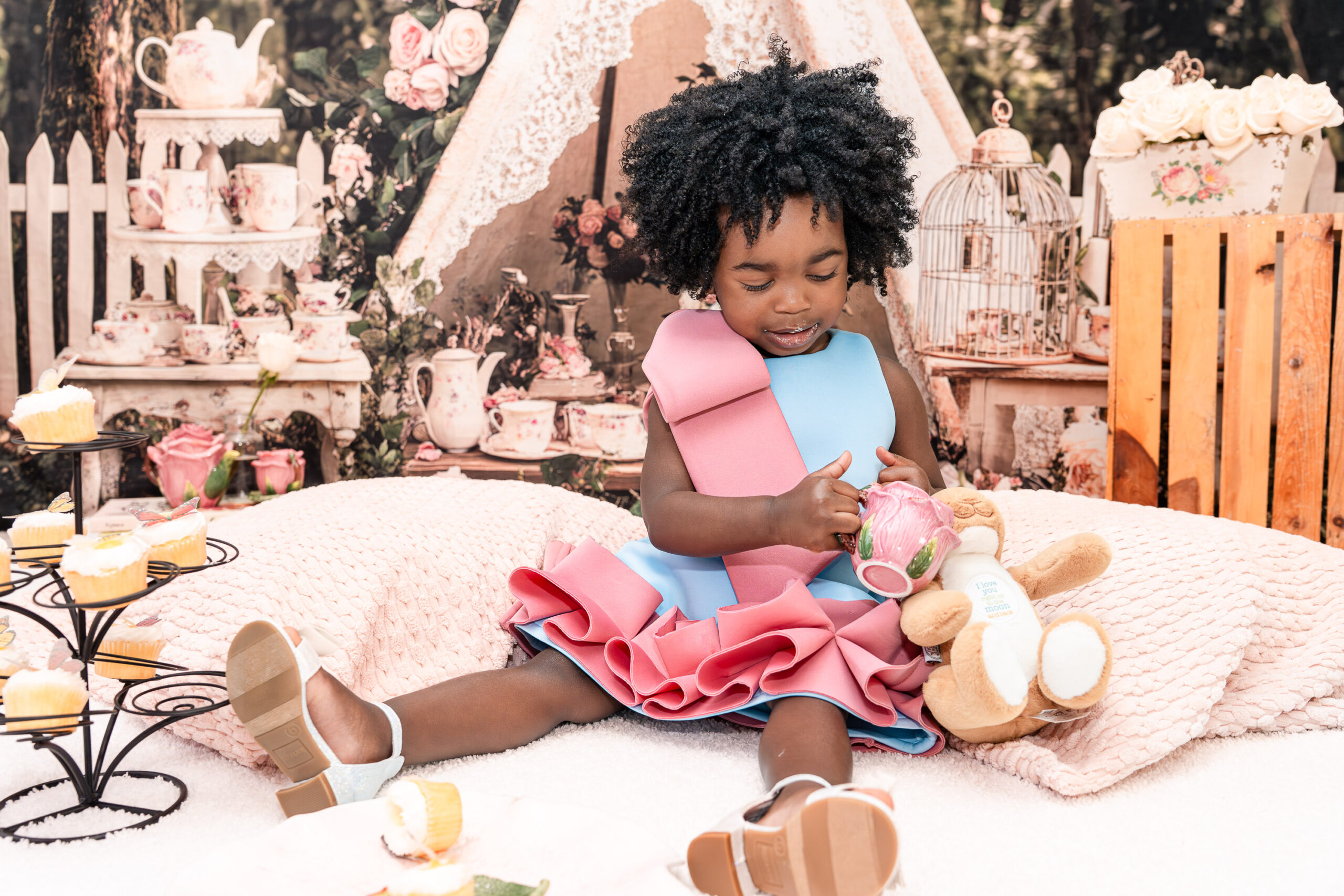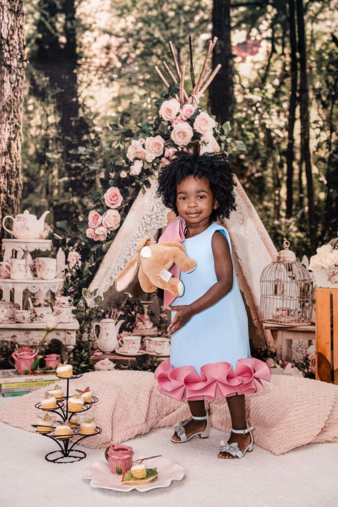 Originally, we talked about incorporating a Mickey Mouse “Toodles” theme (because, of course, Nile is obsessed!), but once I saw the dresses, I knew we needed to lean into something softer and more timeless. I asked Brandi to trust me, and together we created a custom “Tea for Two” birthday photoshoot that blended childhood magic with meaningful details.