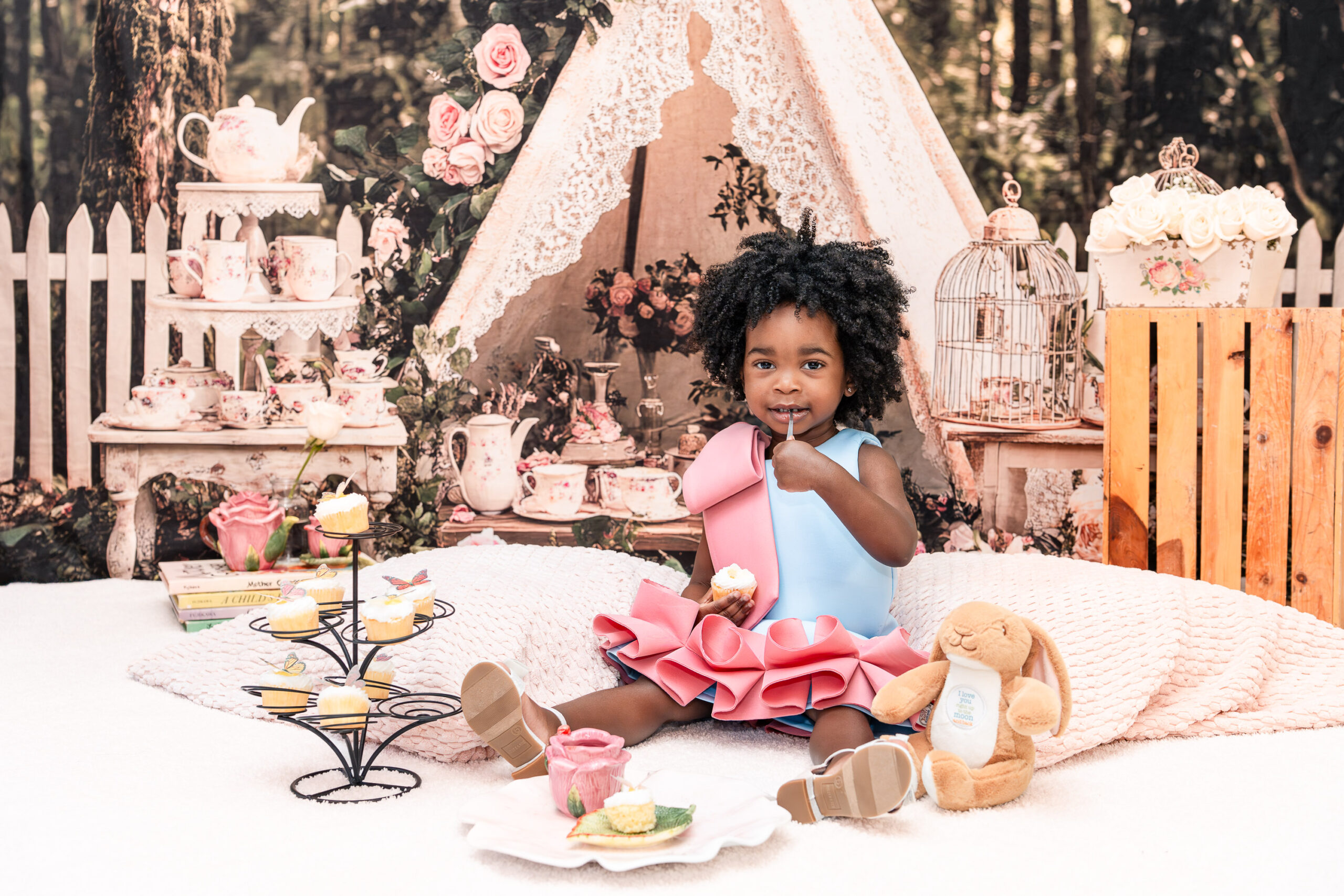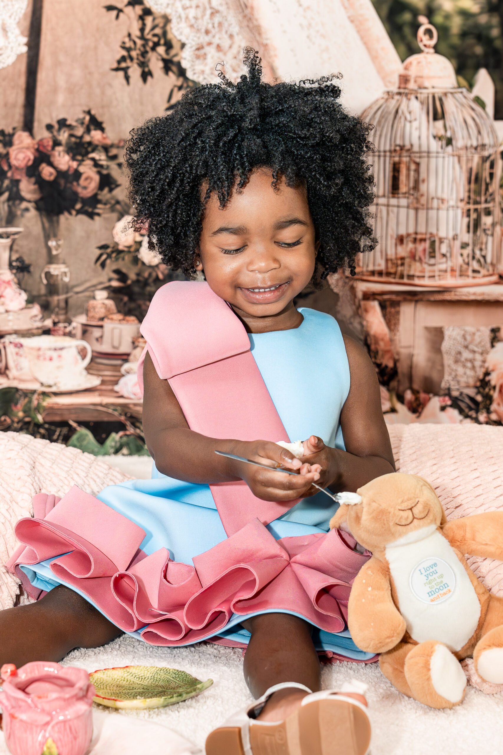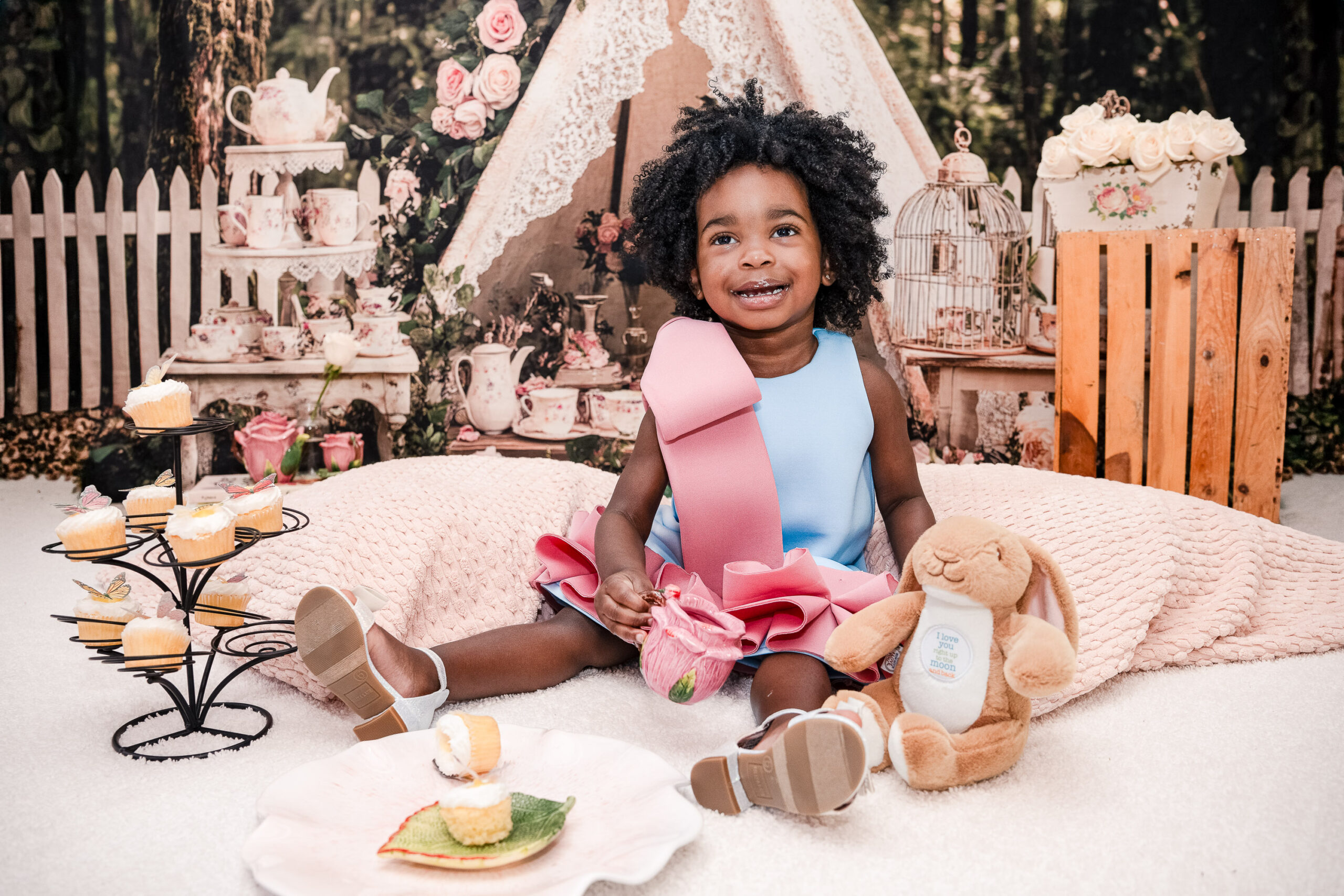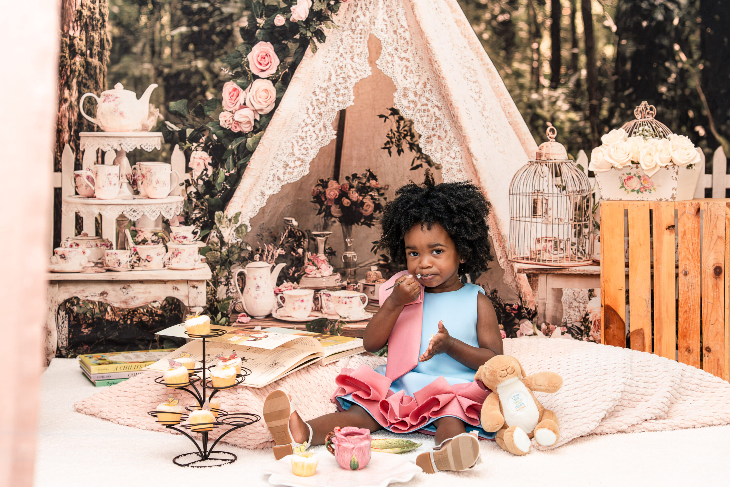Originally, we talked about incorporating a Mickey Mouse “Toodles” theme (because, of course, Nile is obsessed!), but once I saw the dresses, I knew we needed to lean into something softer and more timeless. I asked Brandi to trust me, and together we created a custom “Tea for Two” birthday photoshoot that blended childhood magic with meaningful details.