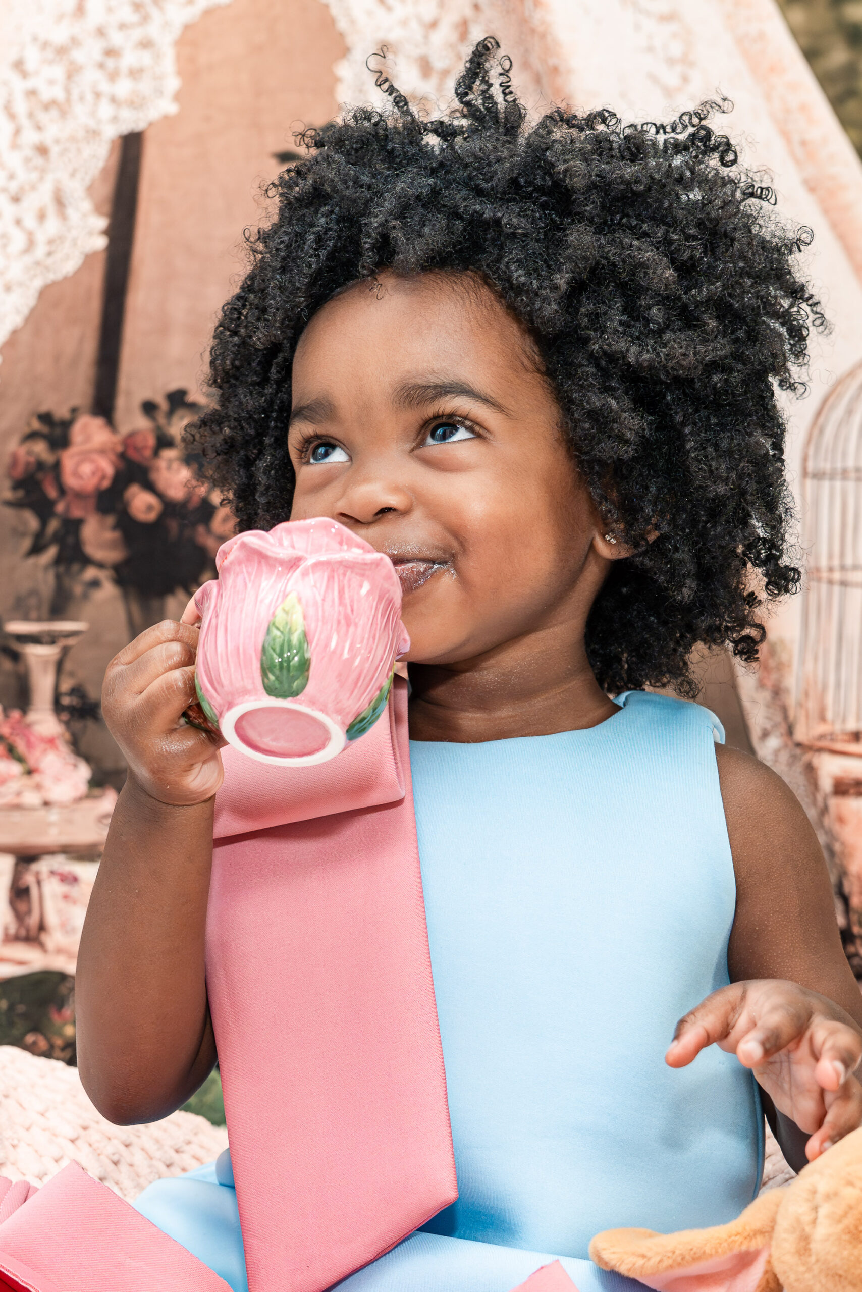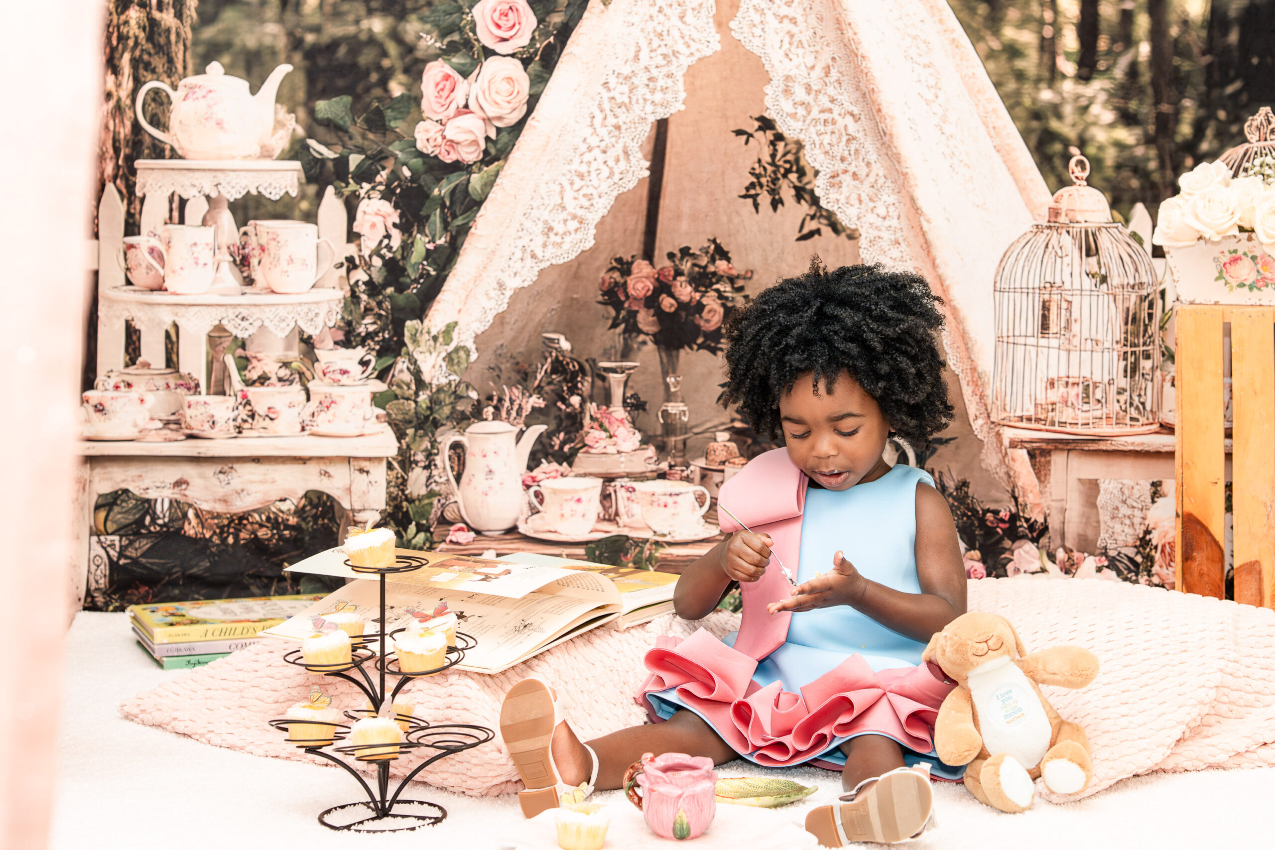 The second look, a vintage-inspired cornflower blue dress, called for something more delicate and refined. We styled a soft tea party scene with roses, a petite rose tea set, and the tiniest lemon cupcakes. Nile carefully “sipped” tea and explored the setup in her own way—those little curious moments that moms always want to remember.