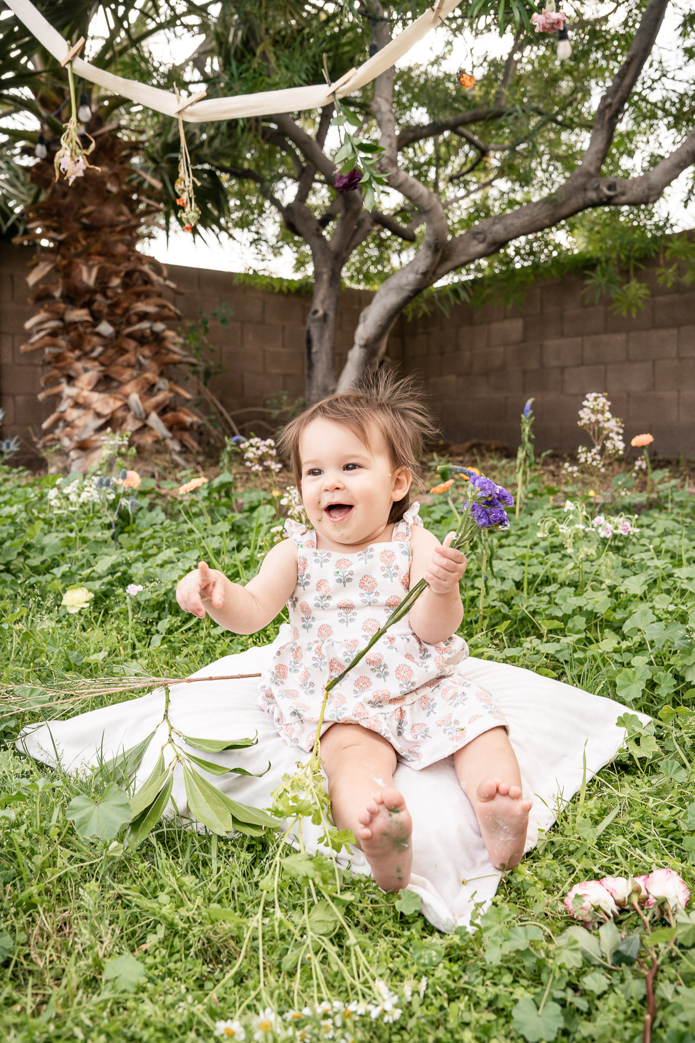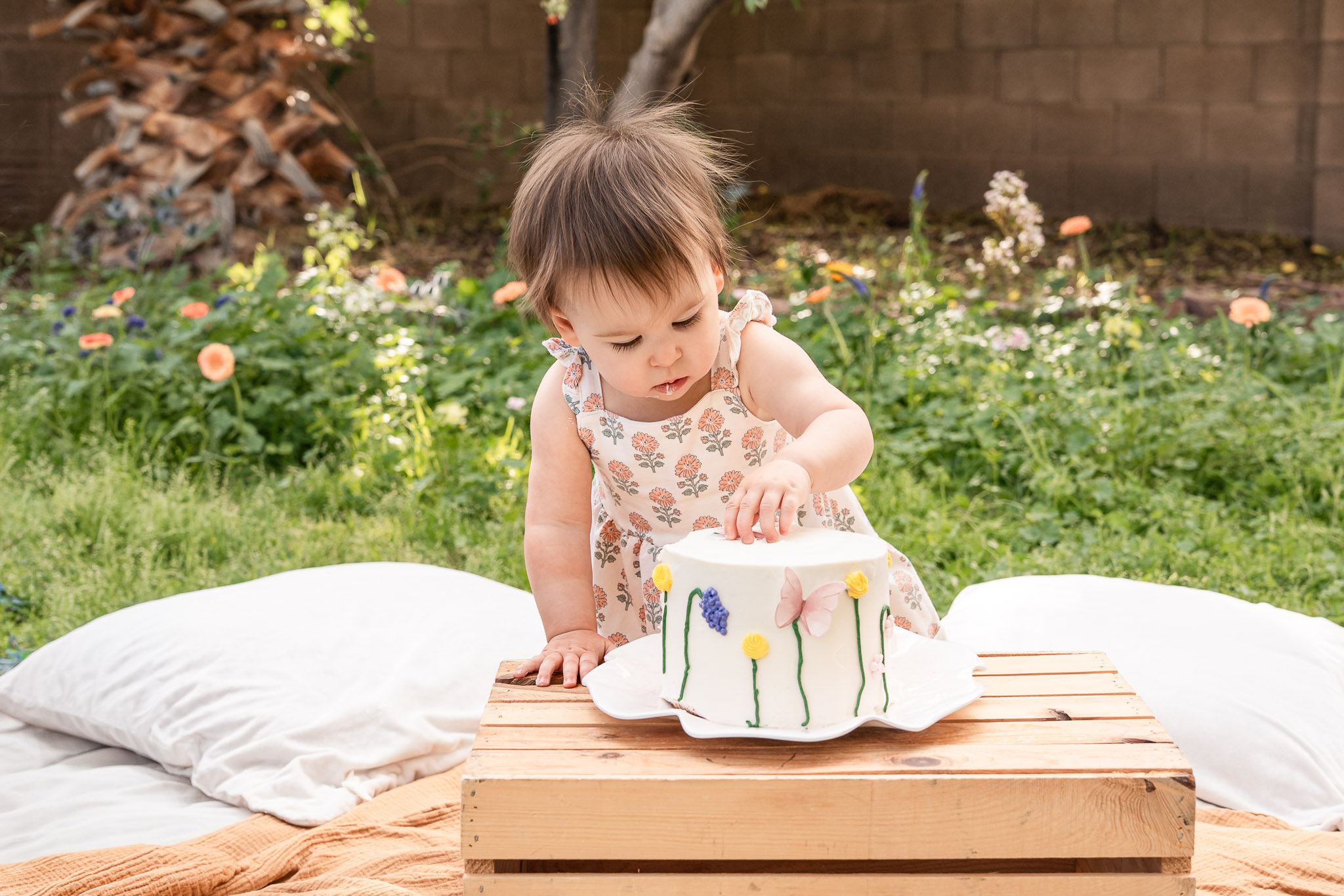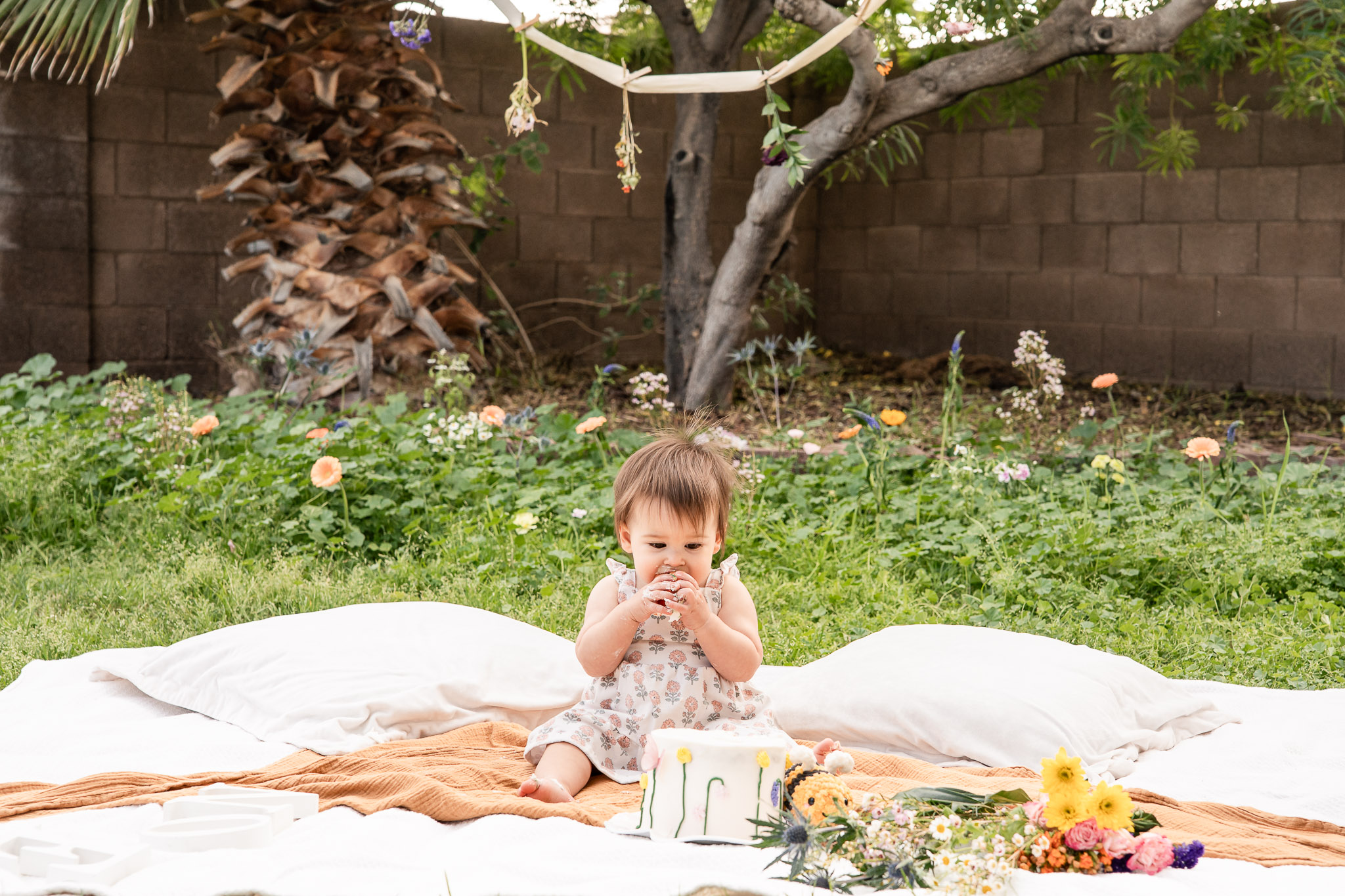 If you’ve lived in Arizona long enough, you know wildflowers are beautiful — and completely unpredictable. Their season is short-lived, which makes planning around them tricky when you’re coordinating a custom cake and a toddler’s ever-changing nap schedule. Instead of hoping for blooms on the scheduled date, I suggested creating a backyard cake smash setup at my home in Avondale, AZ and using fresh flowers from Trader Joe’s. It gave us control, flexibility, and the soft wildflower look Melissa wanted without the stress of Arizona’s desert timing.
