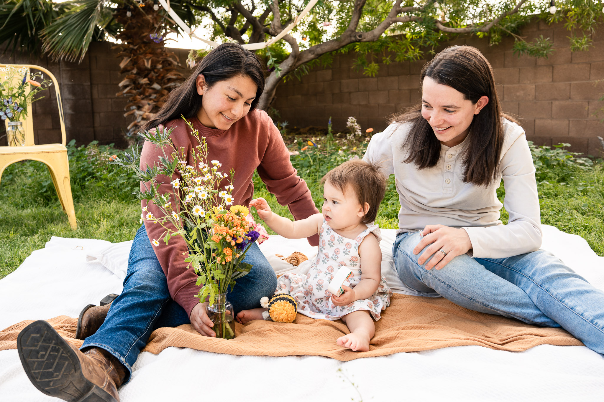 There is something so special about getting to photograph a family on a regular basis, and this was my third time capturing sweet Jordan and her moms. When Melissa reached out to book a first birthday cake smash, it felt like that milestone was forever away — and then suddenly, here we were. For Jordan’s first birthday photos in Avondale, AZ, Melissa envisioned something simple, streamlined, and centered around wildflowers. As a Phoenix cake smash photographer, I love when parents come with a vision and trust me to bring it to life.