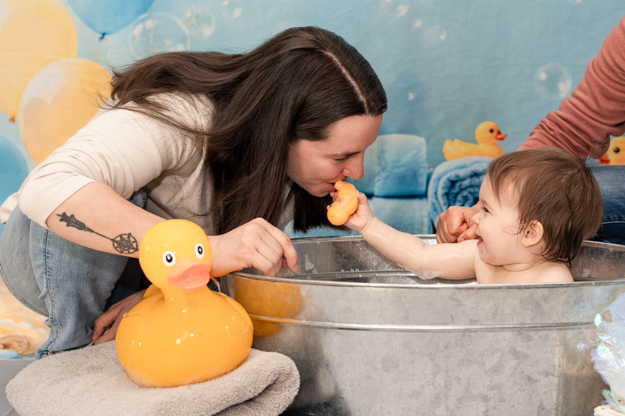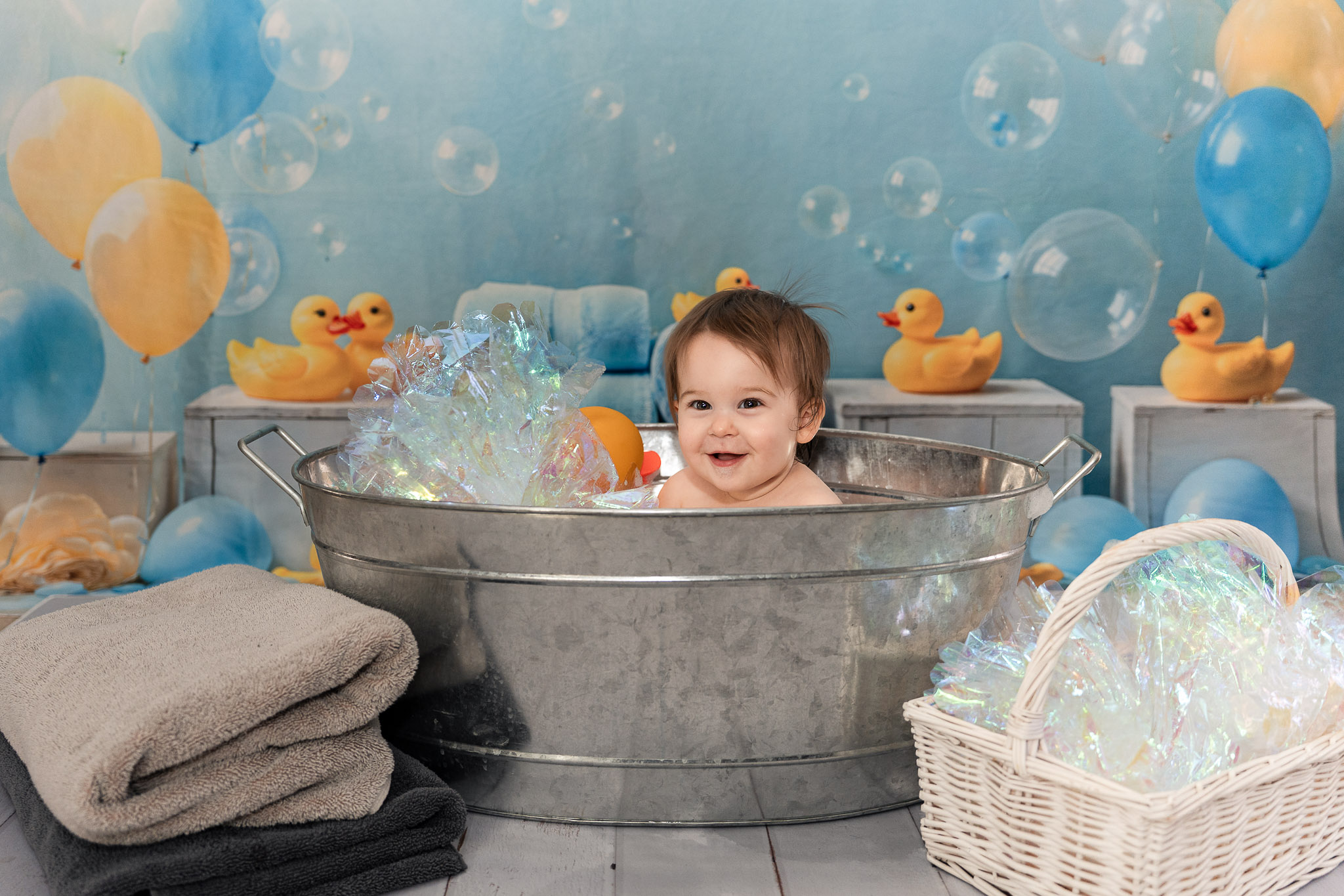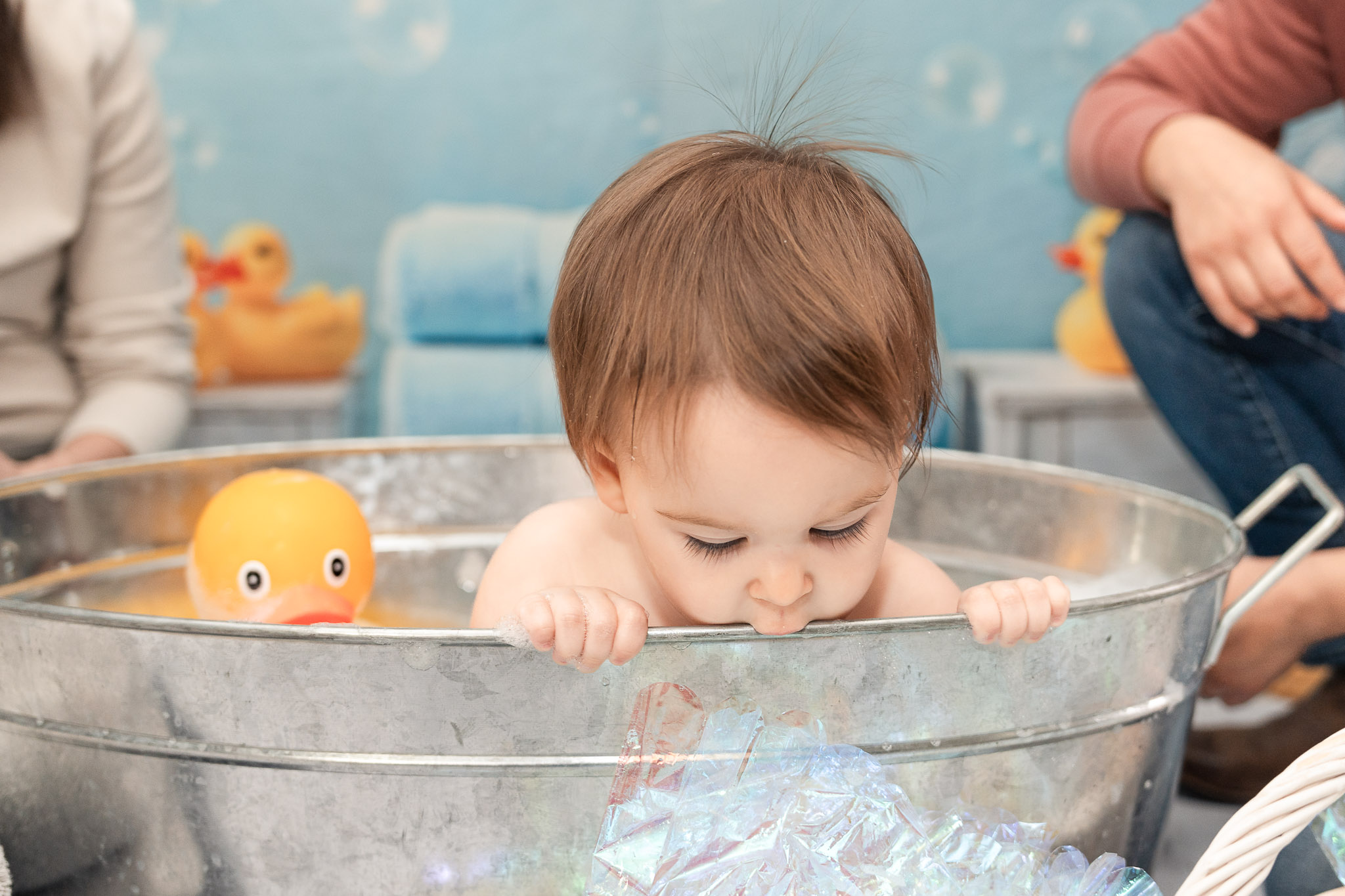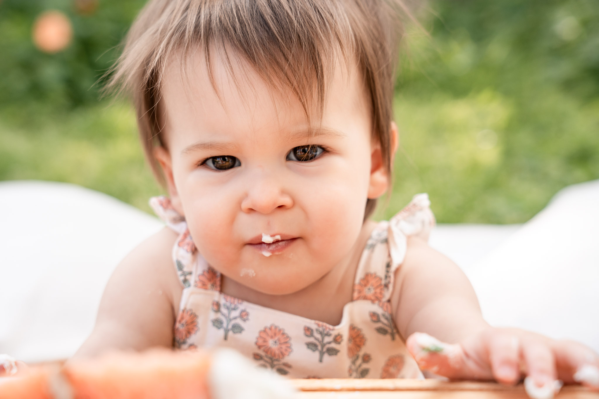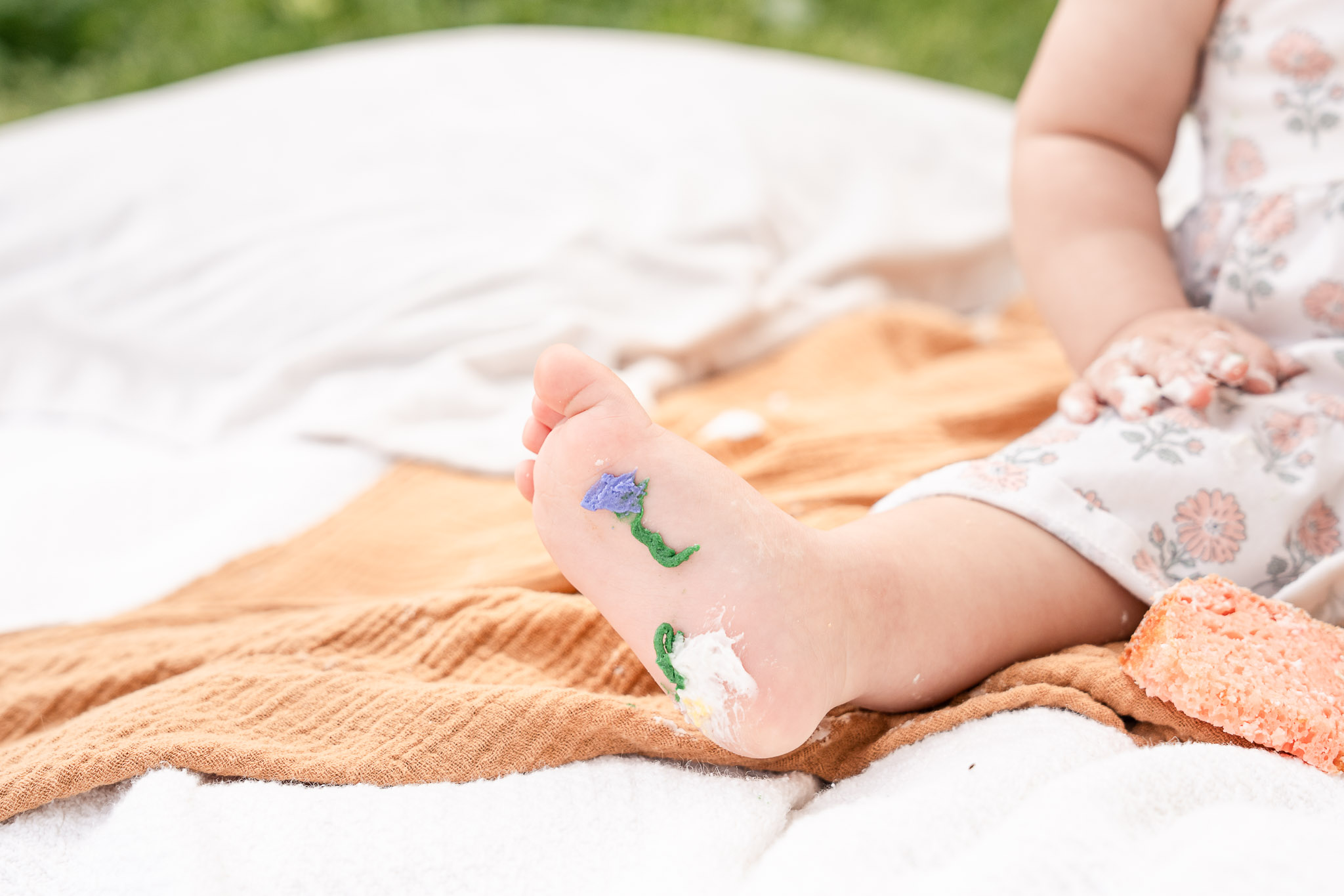 Like all toddler sessions, everything unfolded on Jordan’s timeline. She had just woken from a nap, so we began with family photos to help her feel comfortable. Including parents at the beginning of a first birthday photoshoot often creates a calm, connected start. She was hesitant about the cake at first (as many one-year-olds are), but once her mom Misha gave her a taste of frosting, she was fully committed. Frosting-covered fingers turned into frosting-covered toes, followed by a brief “what is this on me?” moment that every cake smash session needs. The photos flowed from family portraits to include grandparents, to cake exploration, and finally ended in a warm bath — the perfect, joy-filled ending to her Avondale cake smash session.