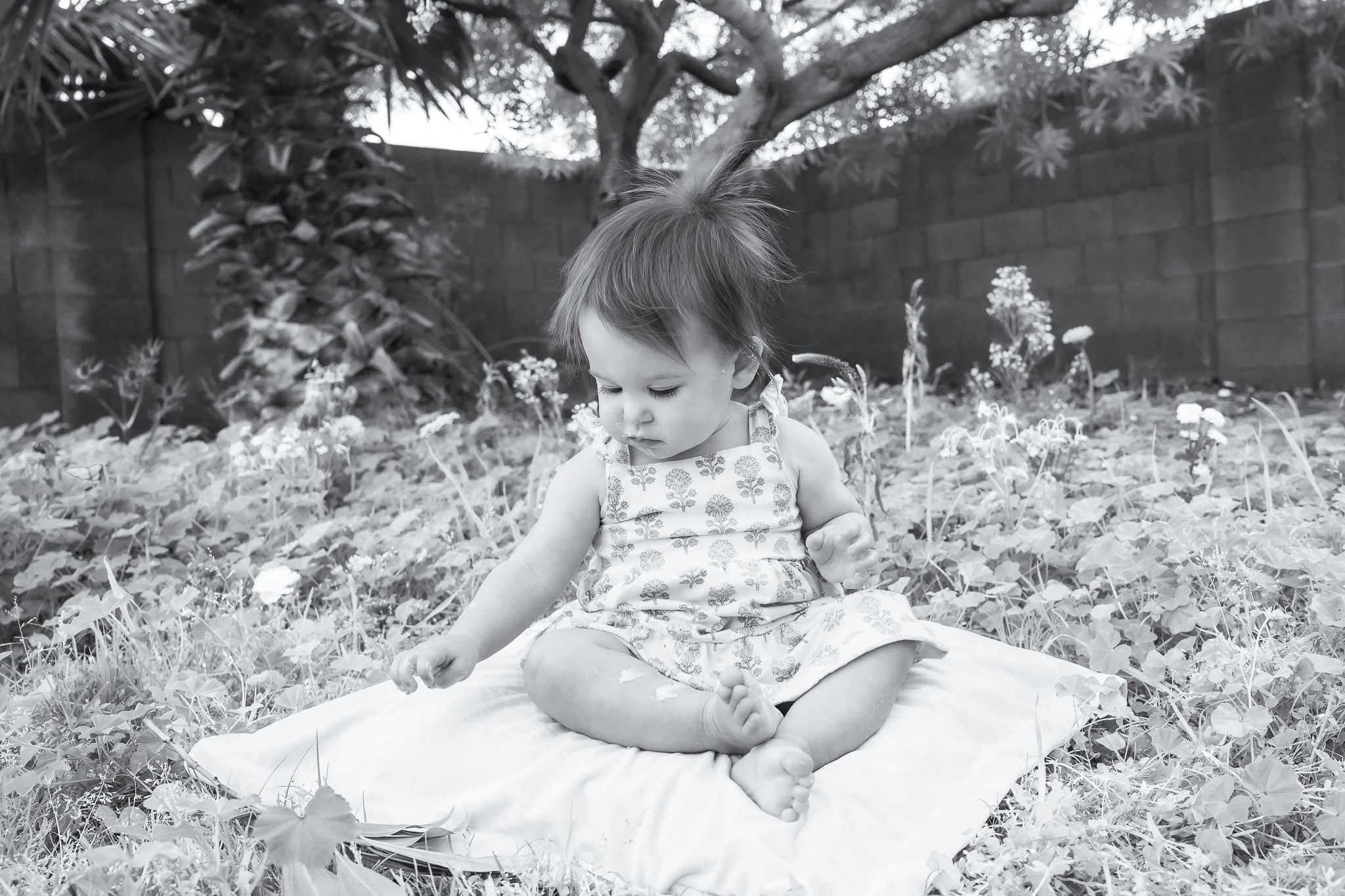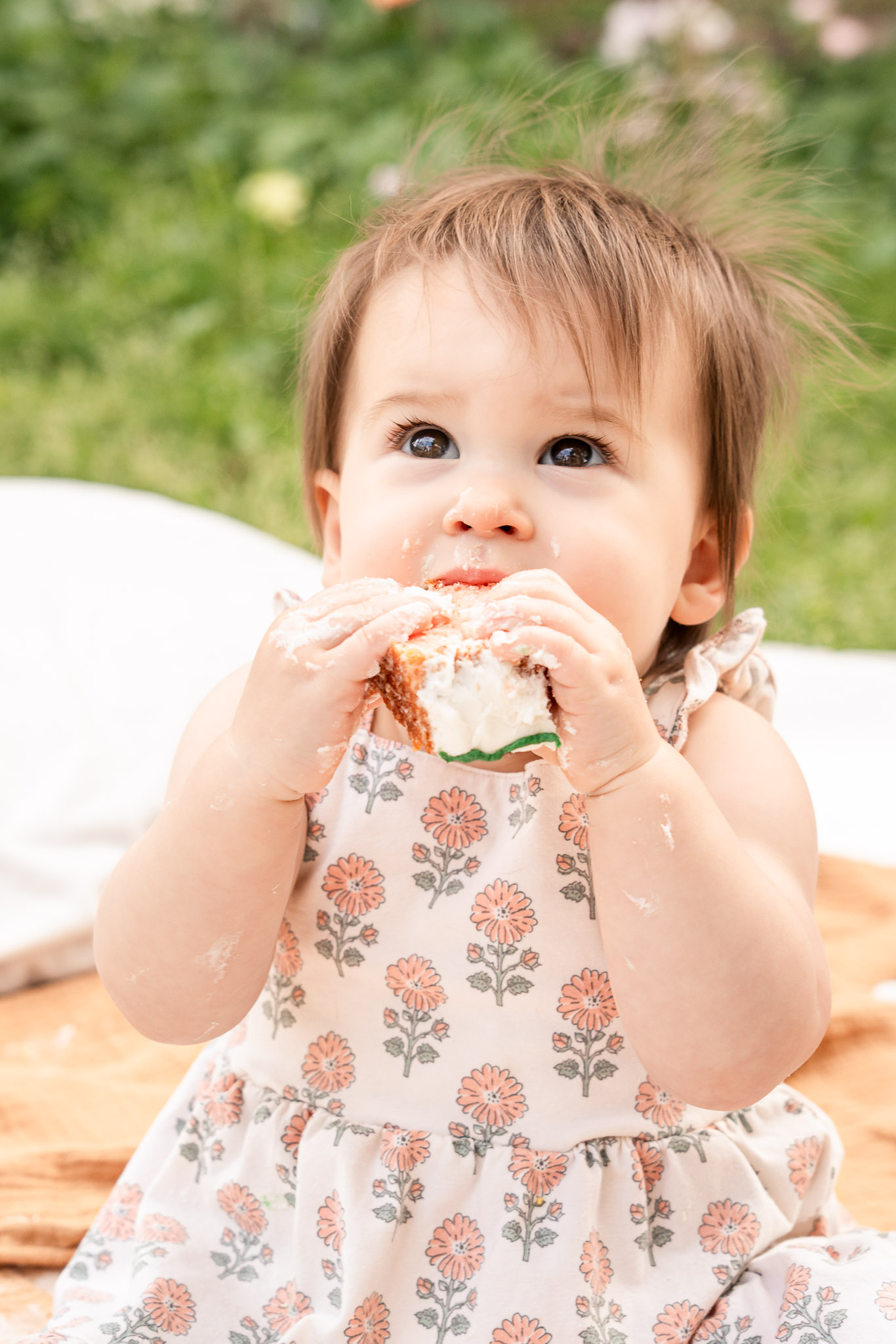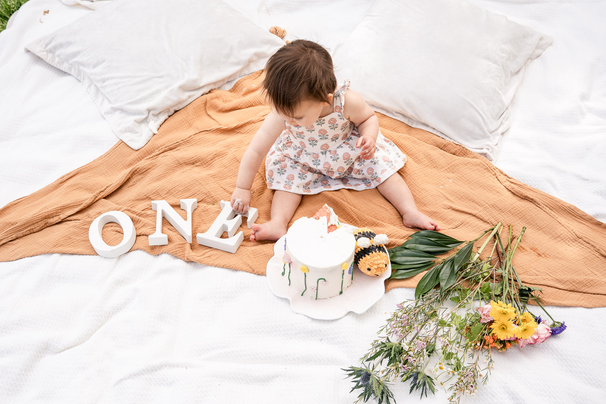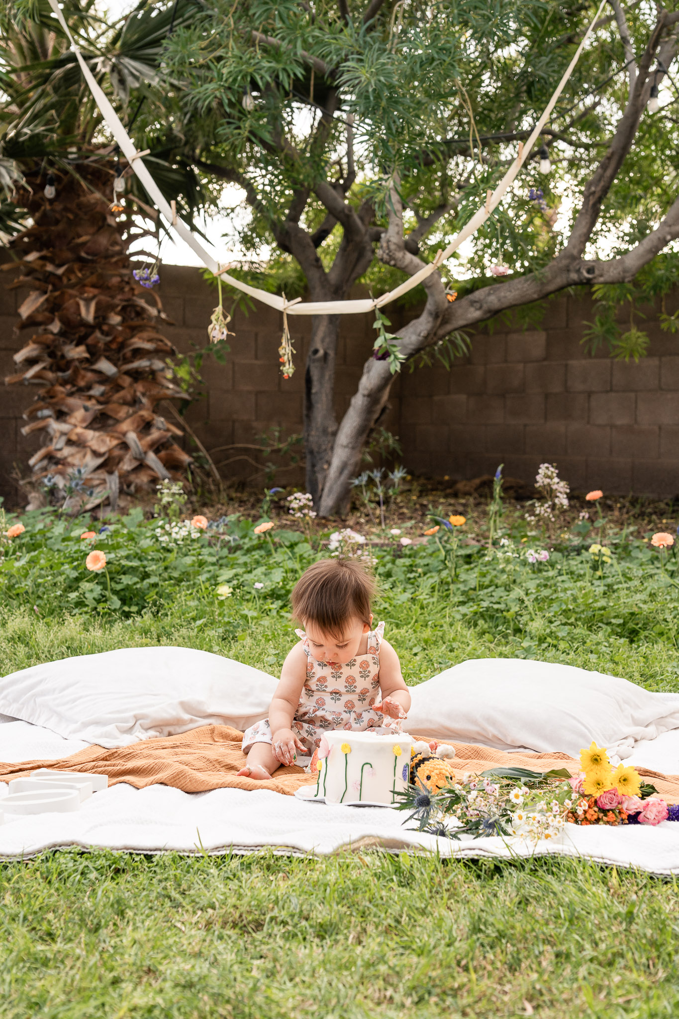 From there, the magic really began. I found the sweetest crocheted bee at the Litchfield Park Farmers Market — because wildflowers and bees belong together, right? I hand-painted a wooden letter “J” with florals to match Jordan’s dress, let my backyard grass grow long for texture, and carefully placed fresh flowers throughout the clover to create a layered garden feel. A simple cream blanket paired with a rust-toned accent matched the florals perfectly, and I styled the cake on a wooden crate alongside the bee and wooden letters spelling “ONE.” As a Phoenix cake smash photographer, I also love adding unique elements — so I hung sheer curtains from a pop up tent to create soft, “through-the-window” portraits that added depth and warmth to the gallery.
